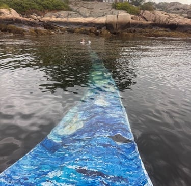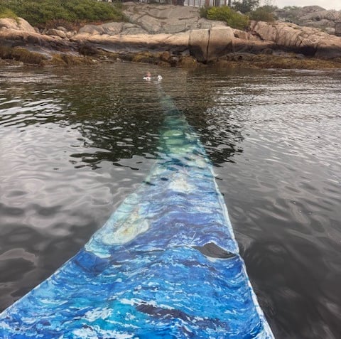 Kate Farrington, Painting Scroll for the Whales (2025), 44 ft, double-sided, underwater, painting scroll for the whales, by Kate Farrington. Fabric paint on fabric. 4' x 44', for the Goetemann Environmental Installation Artist Residency at the Ocean Alliance, Rocky Neck, Gloucester, MA. Installation view: Festival launch at Expedition Oceanbourn: Final Convivium, Tarr & Wonson Paint Factory at the Ocean Alliance in Rocky Neck, MA, September 28, 2025.
